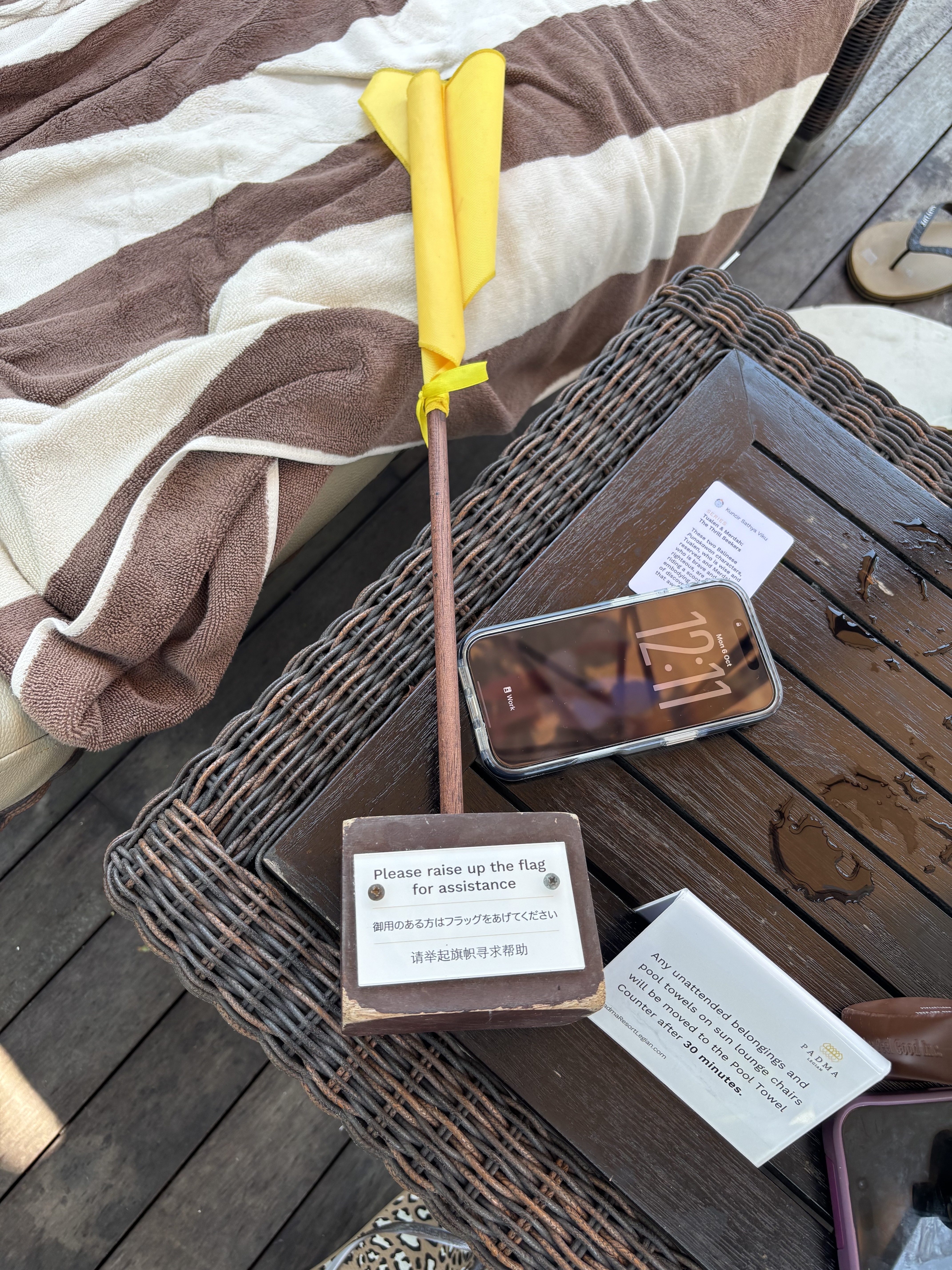 スタッフを呼ぶときは机の上の小さな旗を上げるユニークなスタイルで、日本語表記もあるので安心です。