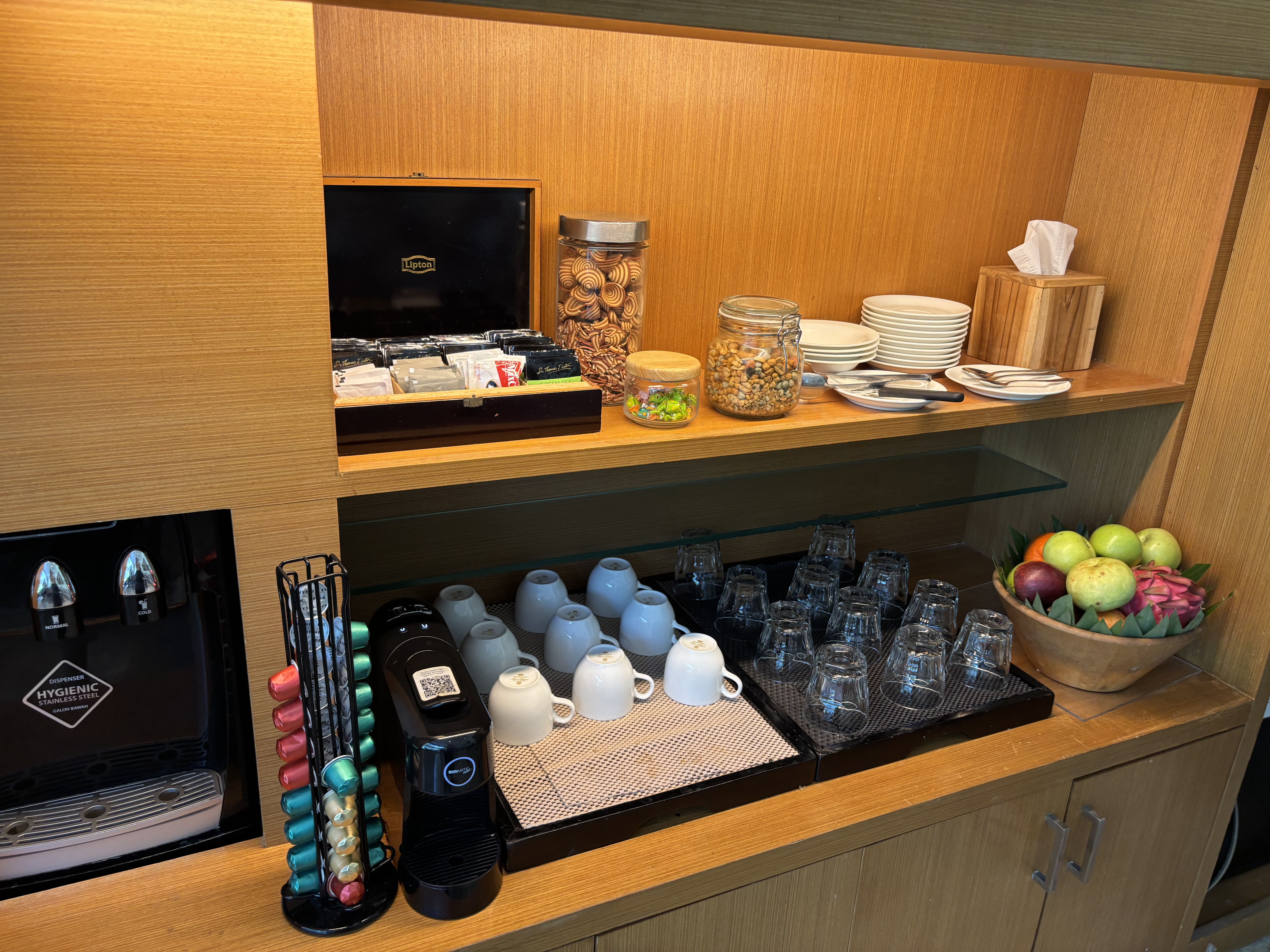 ラウンジ内にはクッキーなどのスナックや、コーヒー・紅茶の用意があり、出発前のひとときを快適に過ごせます。