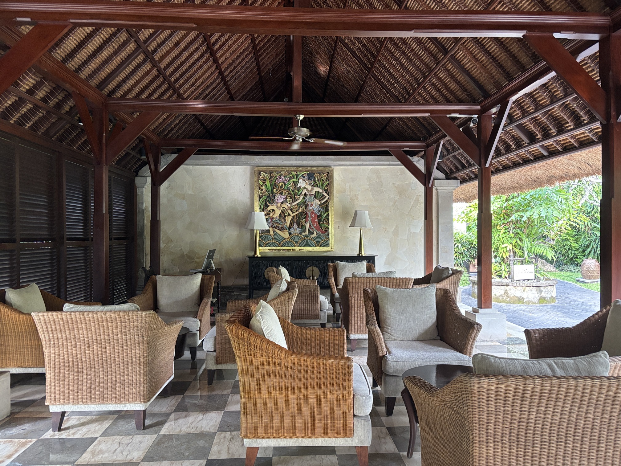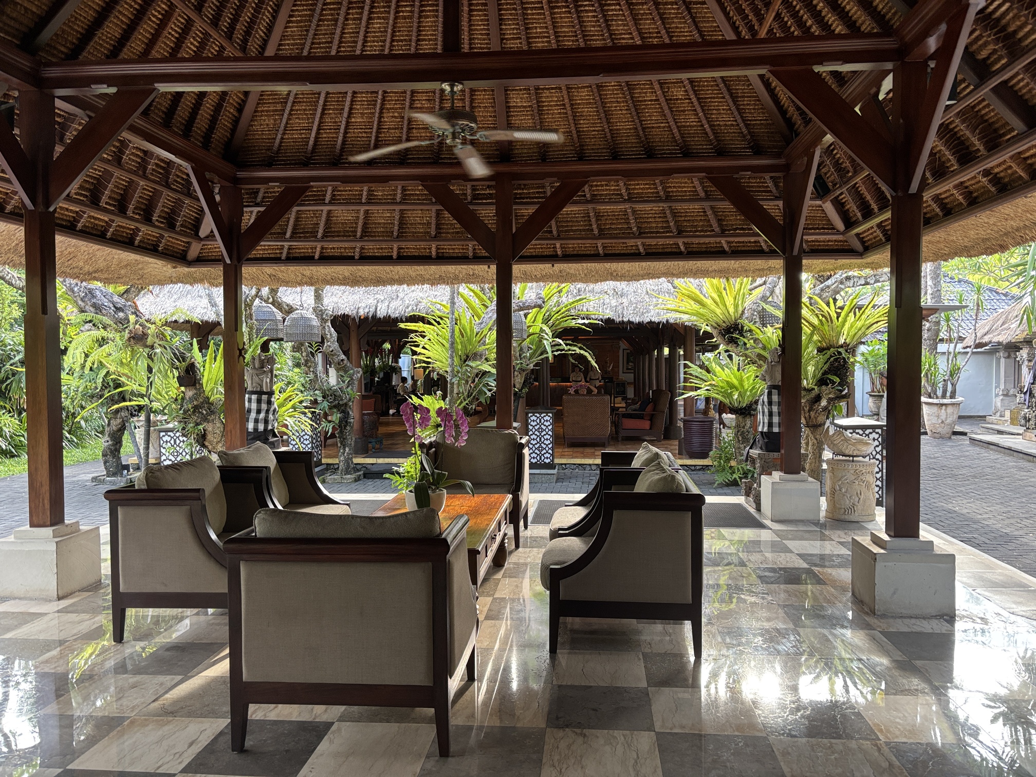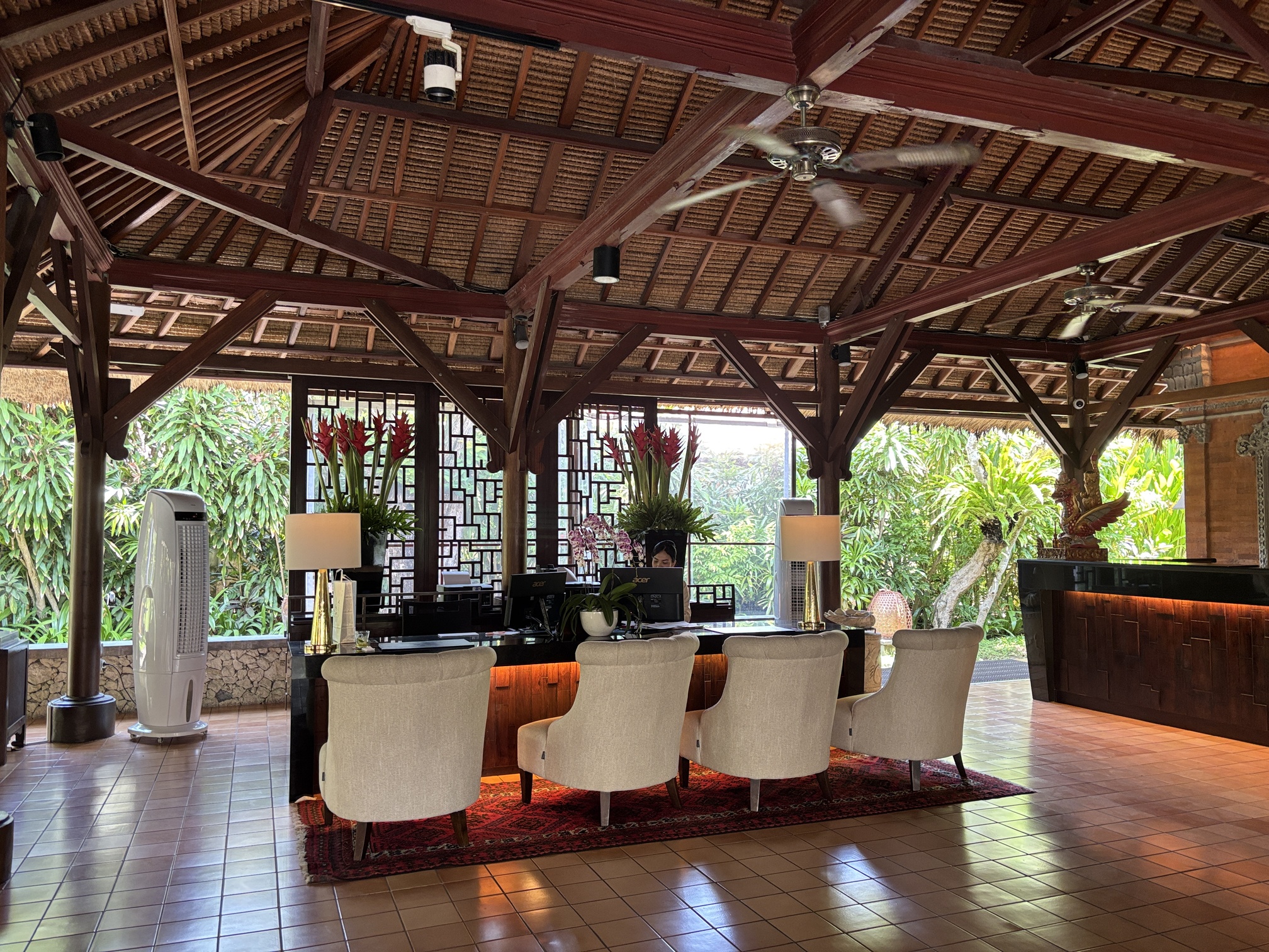 老舗ならではのバリらしさが感じられる、開放感のあるロビー。