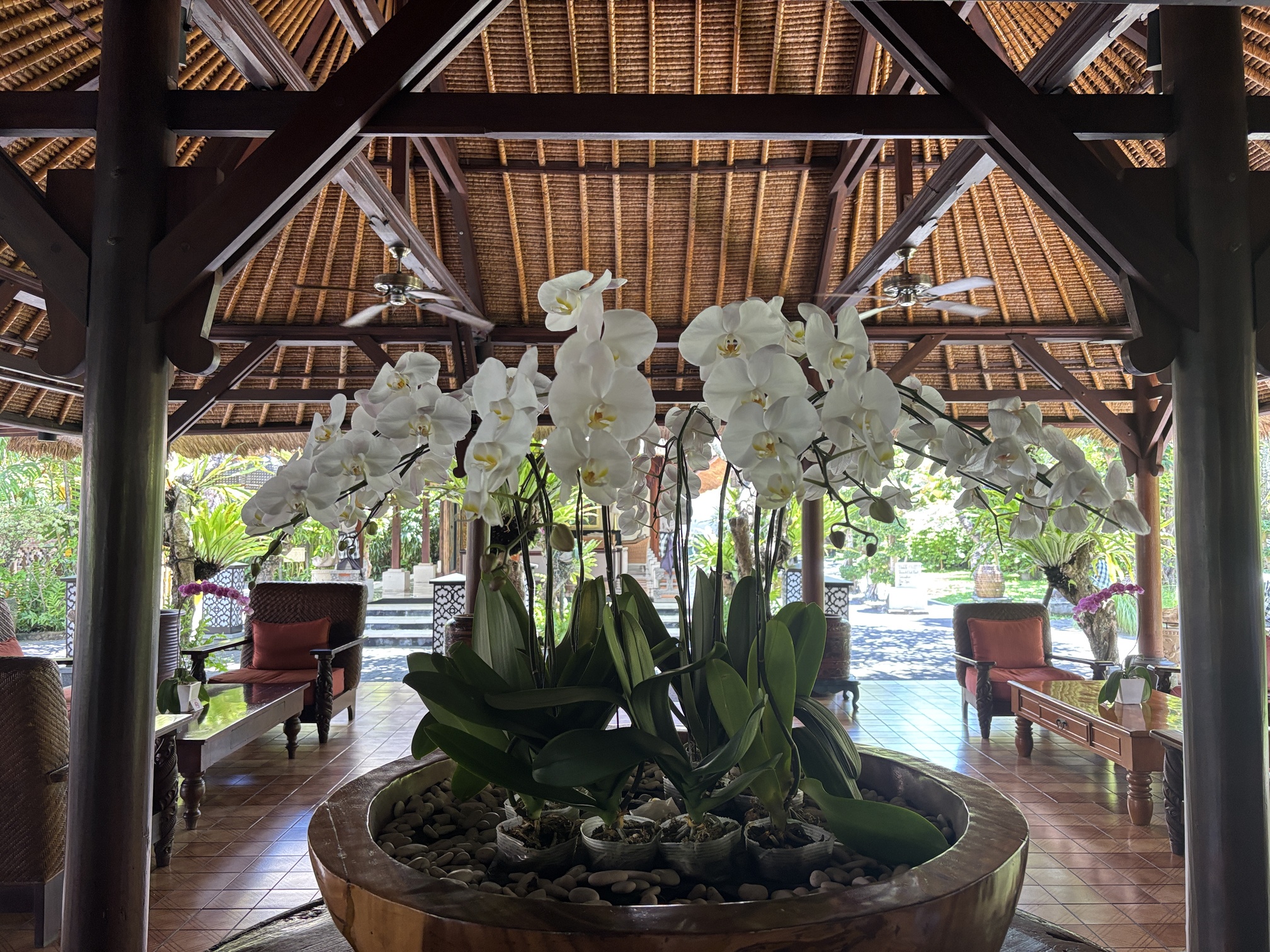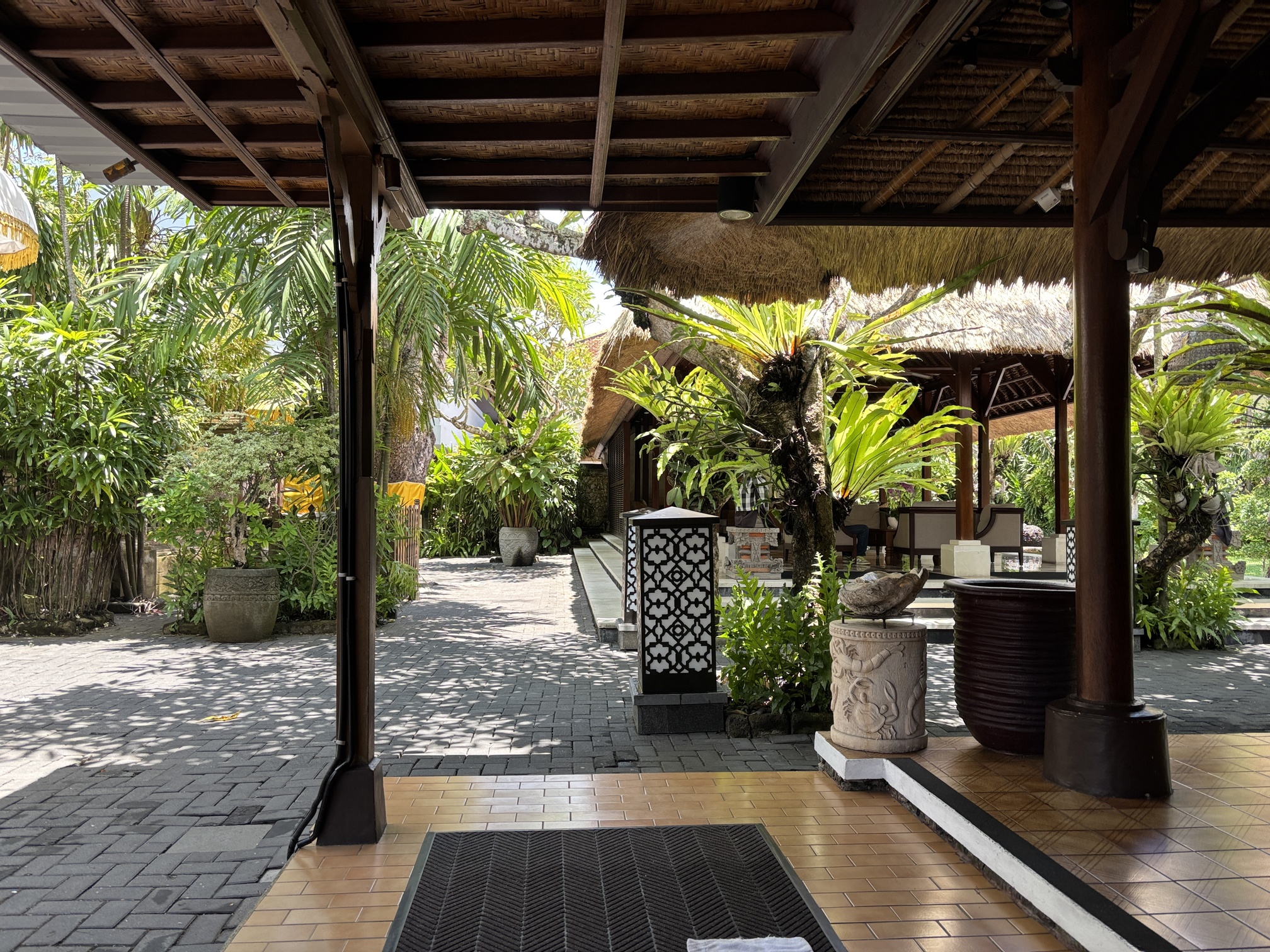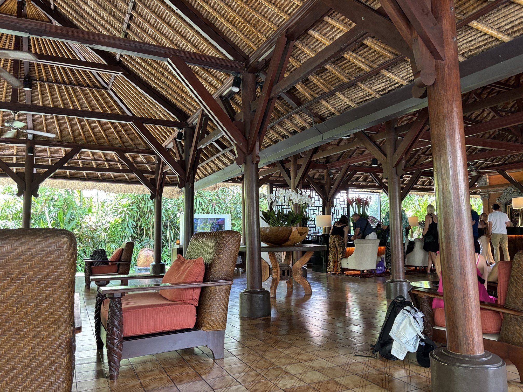 老舗ならではのバリらしさが感じられる、開放感のあるロビー。