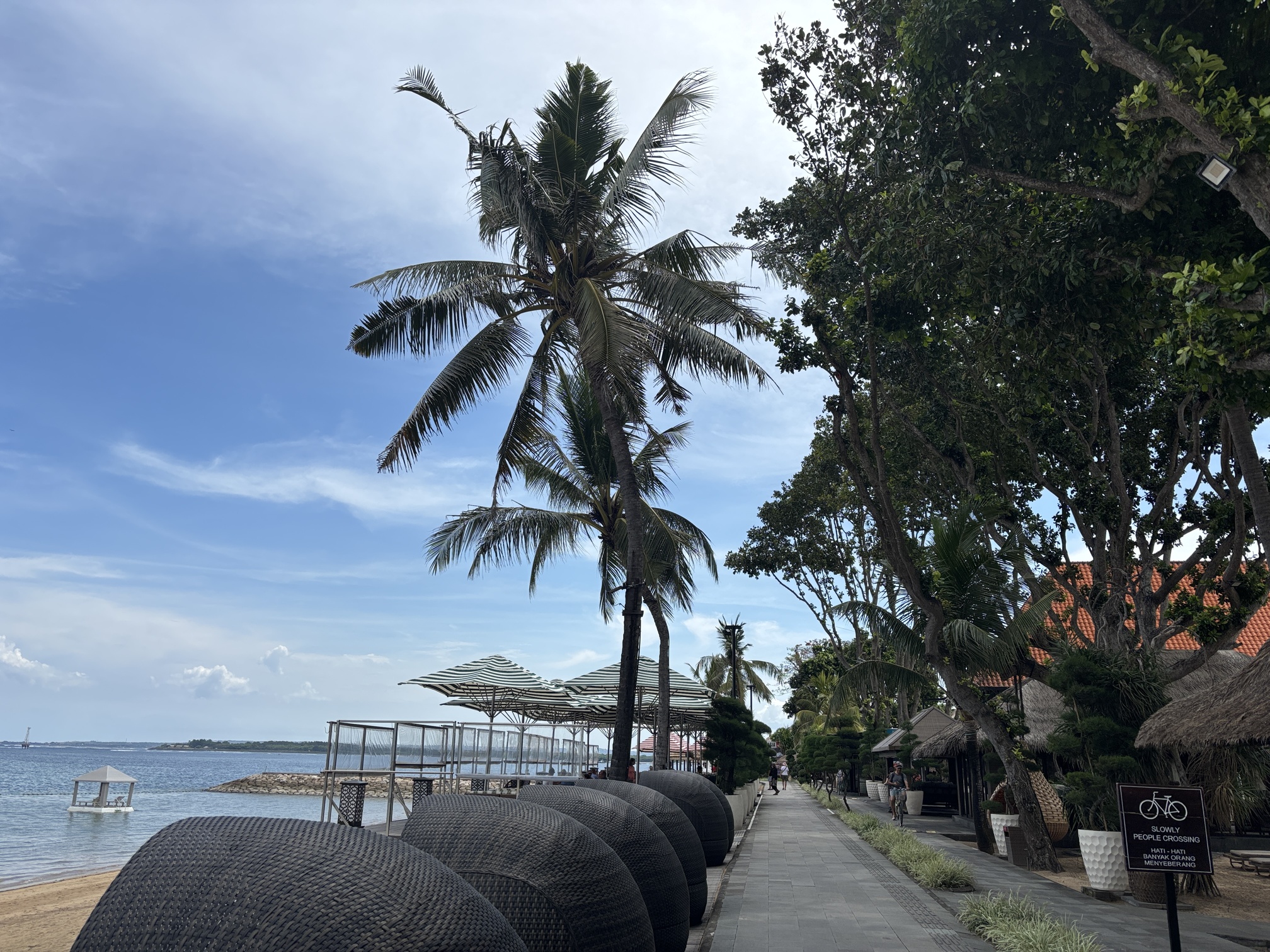 長く続くサヌールビーチ、美しい景色と心地の良い風がお散歩にぴったり。雨季は長く歩くと本当に暑いので、レンタルサイクルを借りての探索もおすすめです。