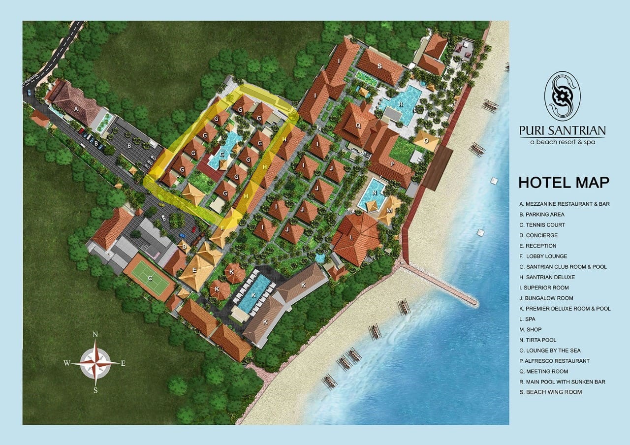 こちらがプリ サントリアンのマップ、黄色マーカーで囲ったところが今回宿泊したサントリアンクラブがあるエリア。