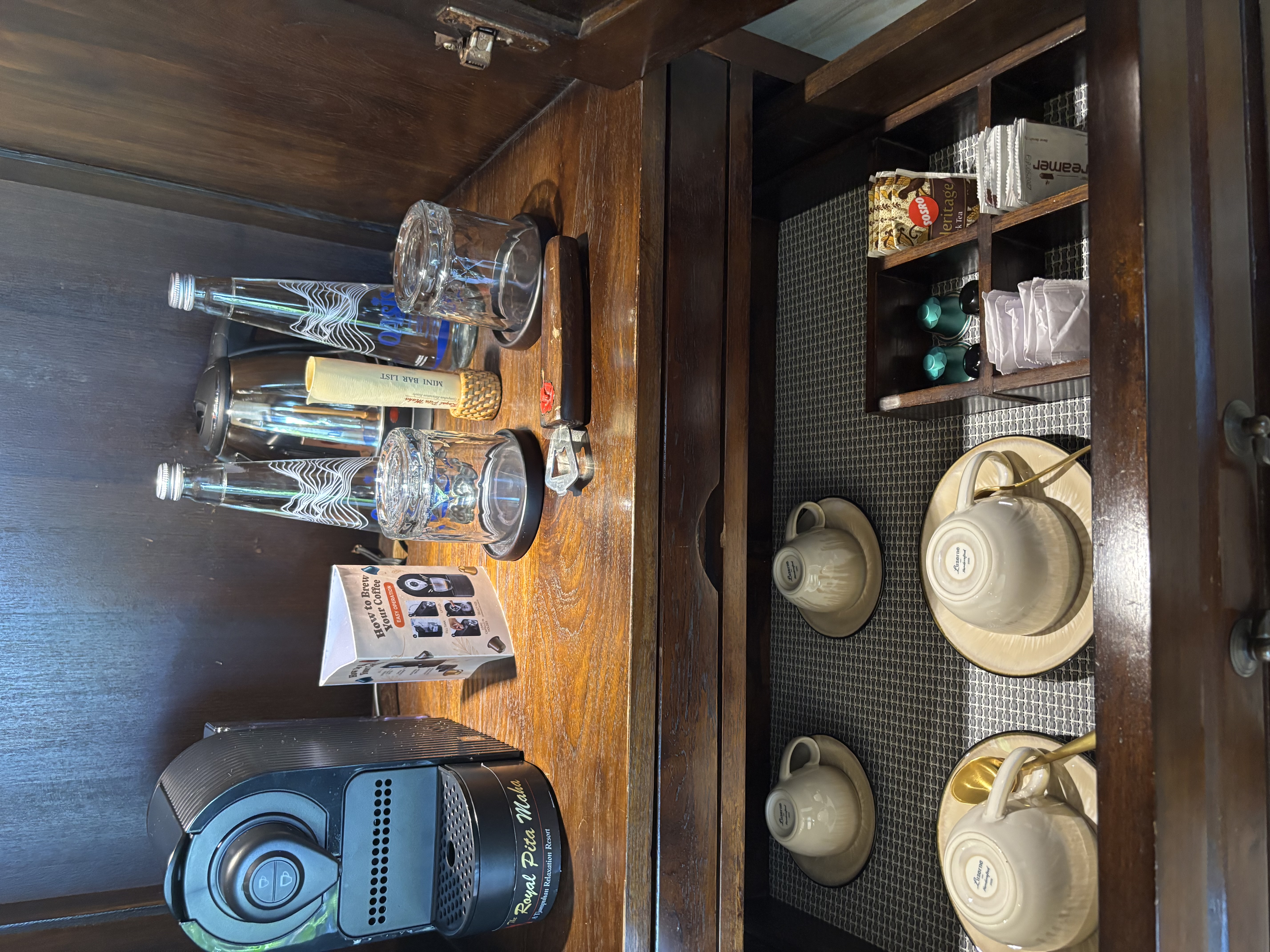 リビングルームにはソファセットとウェルカムフルーツ、小さな丸机が用意され、テレビ周りにはお水、コーヒー・紅茶、ミニバー、購入できるスナック類など必要な備品がしっかり揃っています。