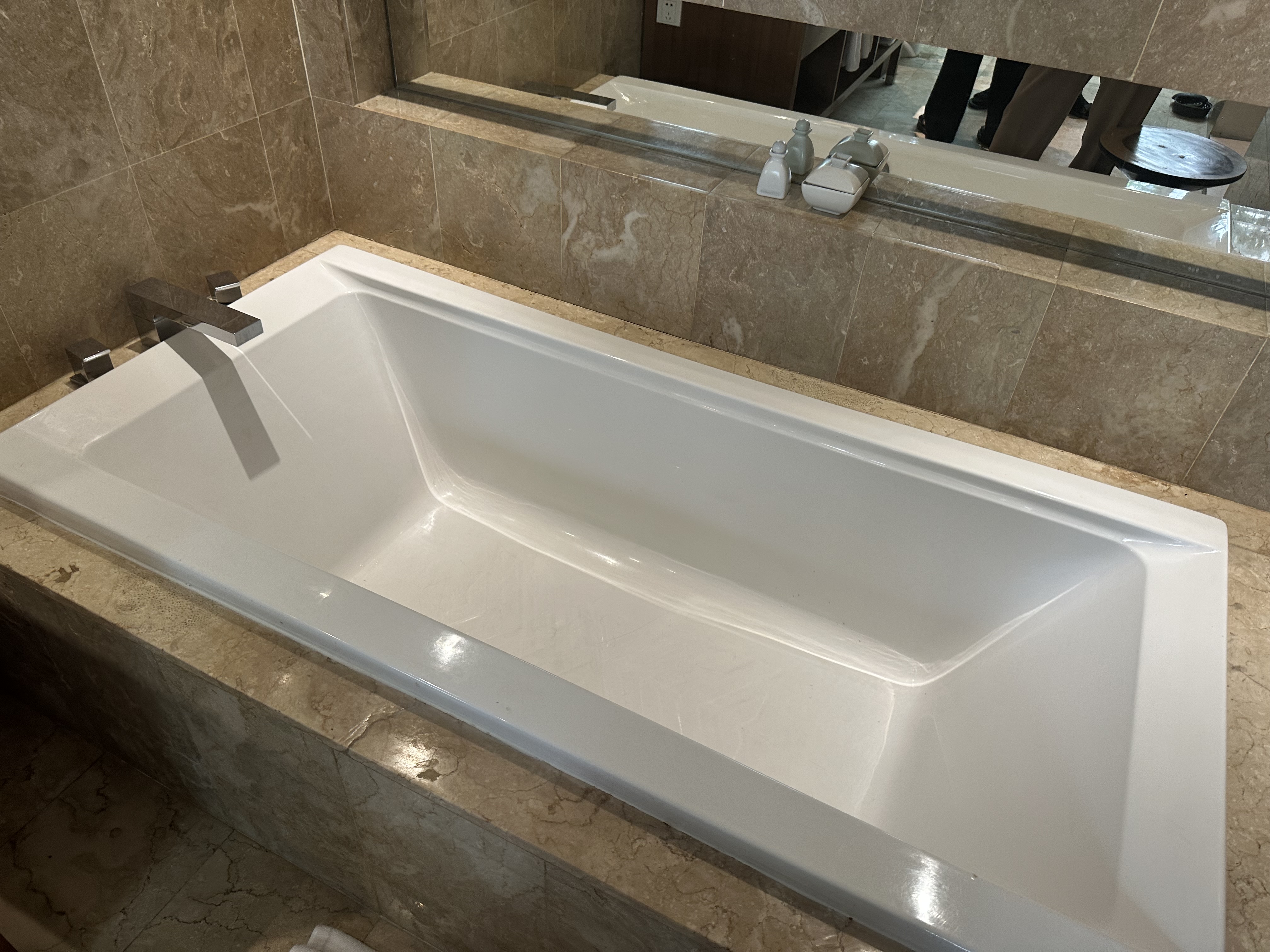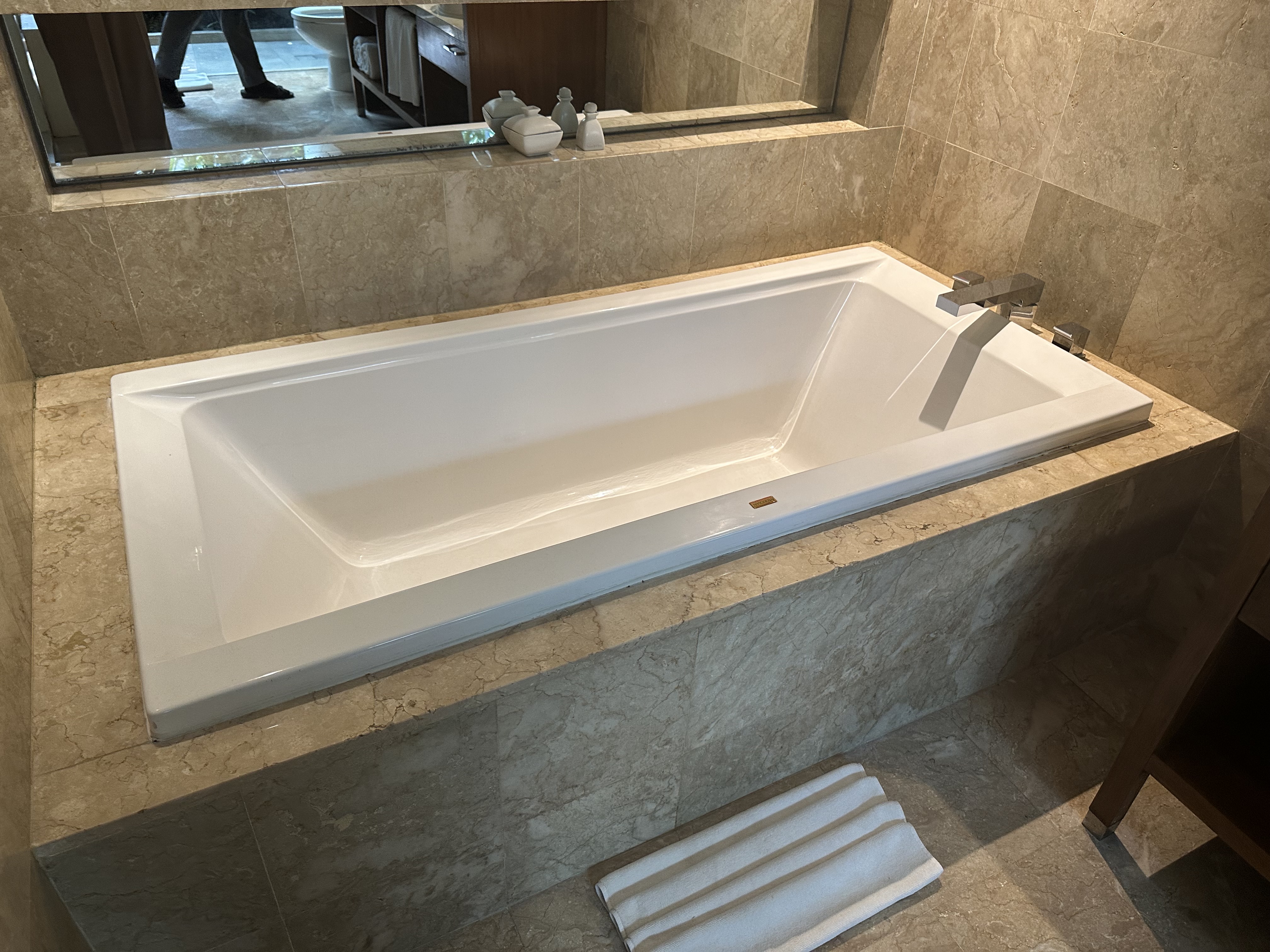 水回りスペースは全体的にゆとりがあり、バスタブも大きくて快適に使えそうな印象を受けました。また、バスタブ付近には虫よけ装置が置かれており、こうした細かな配慮がされている点も好印象でした。