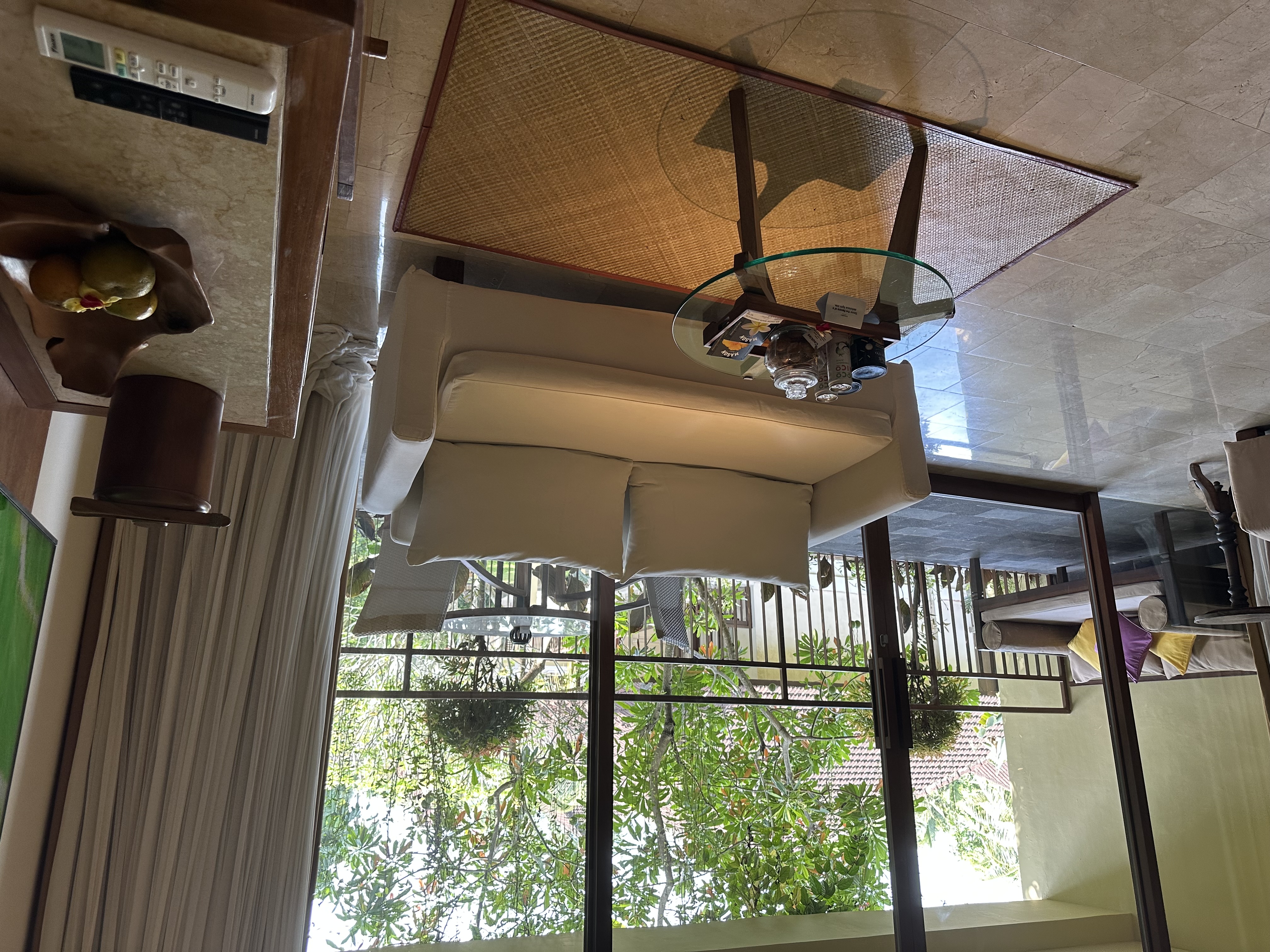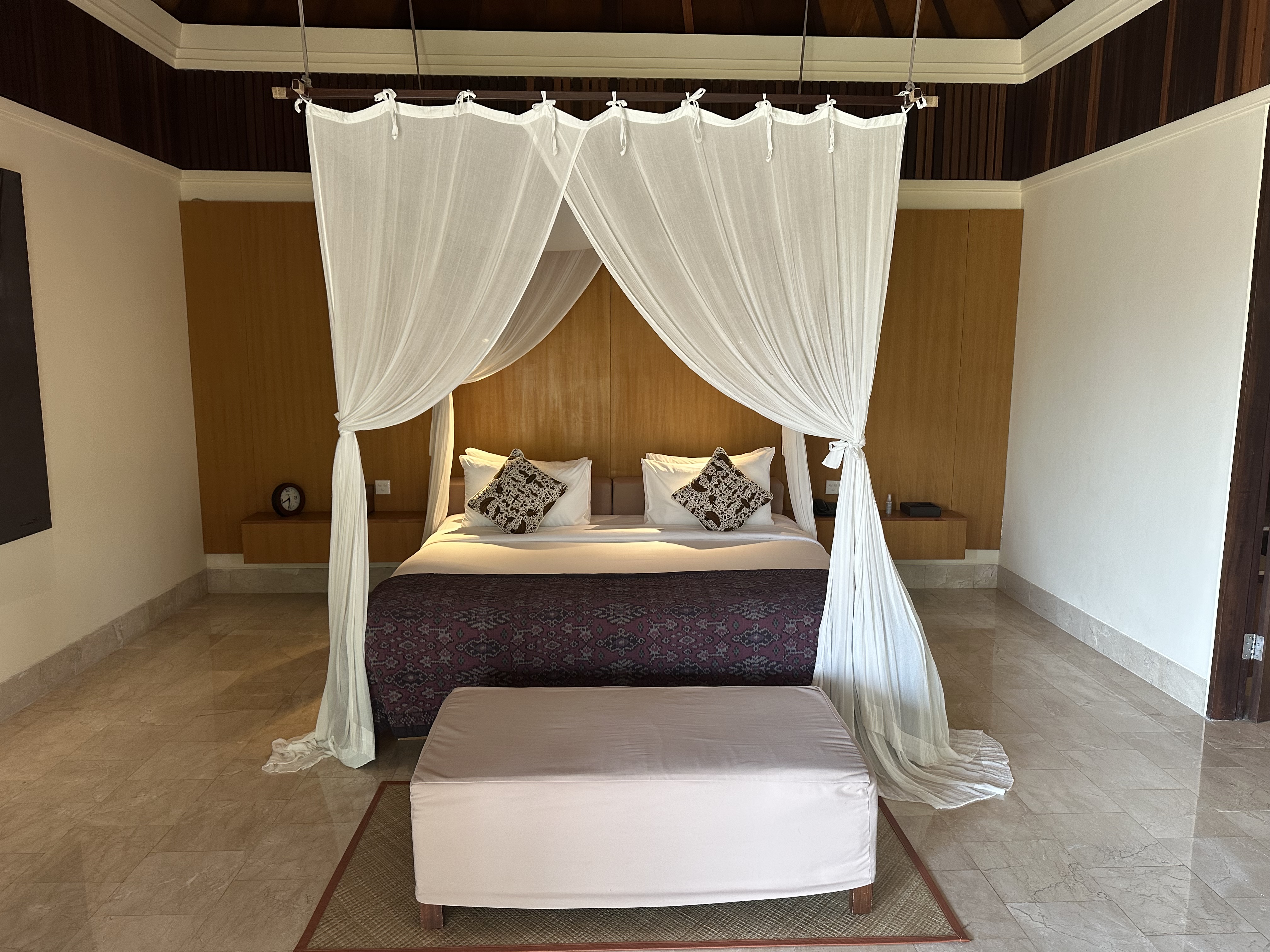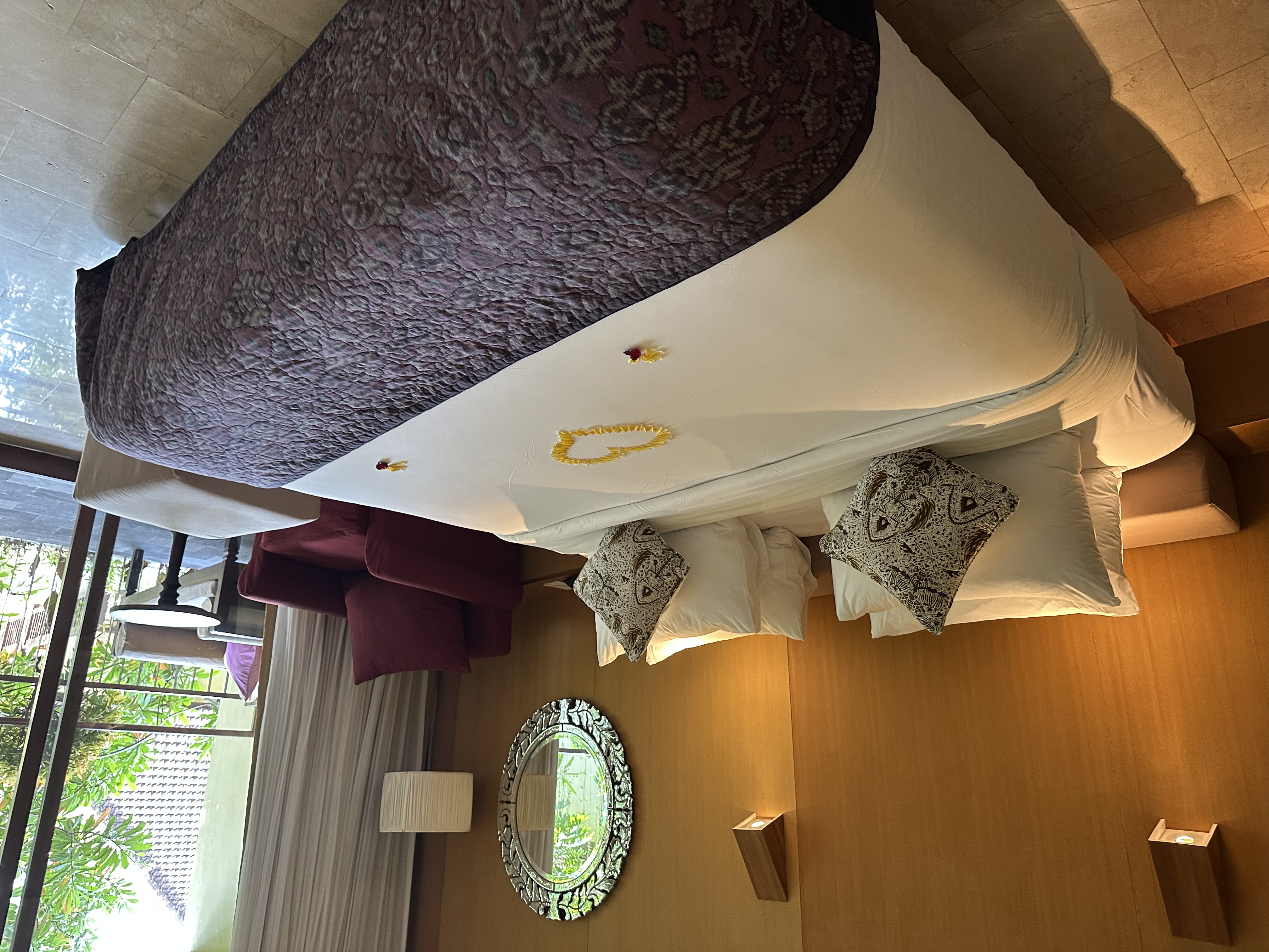 今回宿泊したお部屋は、バリらしさを取り入れたシンプルな造りながらも65uと広々としており、まるでスイートルームのようなゆとりを感じられました。全体的に落ち着いた雰囲気で、のんびり過ごすのにぴったりなお部屋です。
