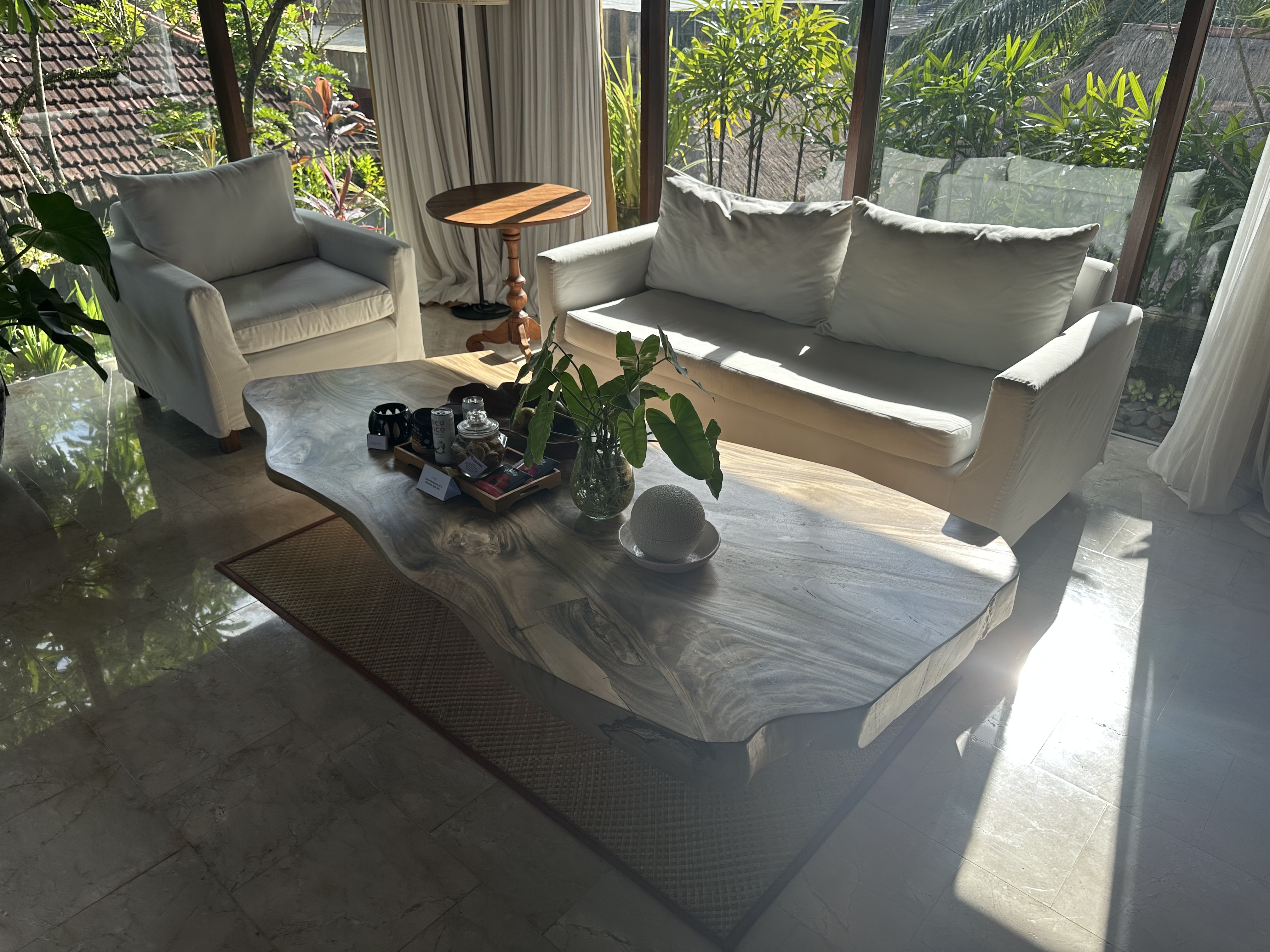 ホテルの屋上に位置するヴィラで、リビングスペースは窓が多く、開放感があり明るく感じられます。テラスにはラウンジチェアが設置されており、ウブドの街並みやガーデンの景色をゆっくり楽しむことができます。