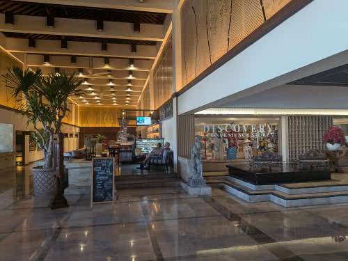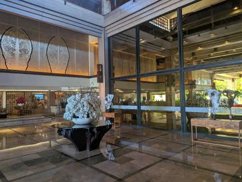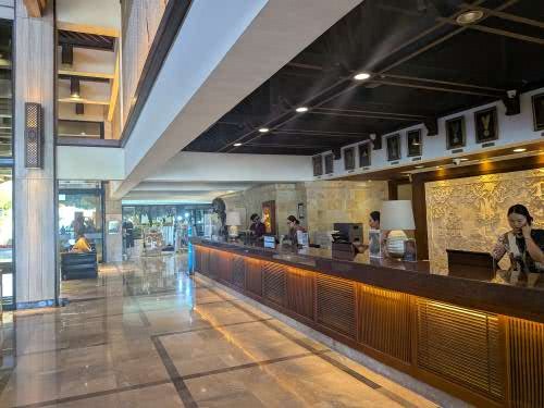 ディスカバリー・カルティカ プラザ ホテルのフロントは、吹き抜けの天井と大きな窓が特徴的で、明るく開放感のある空間が印象的でした。バリらしい装飾があしらわれ、リゾートらしい落ち着きと温かみを感じられます。