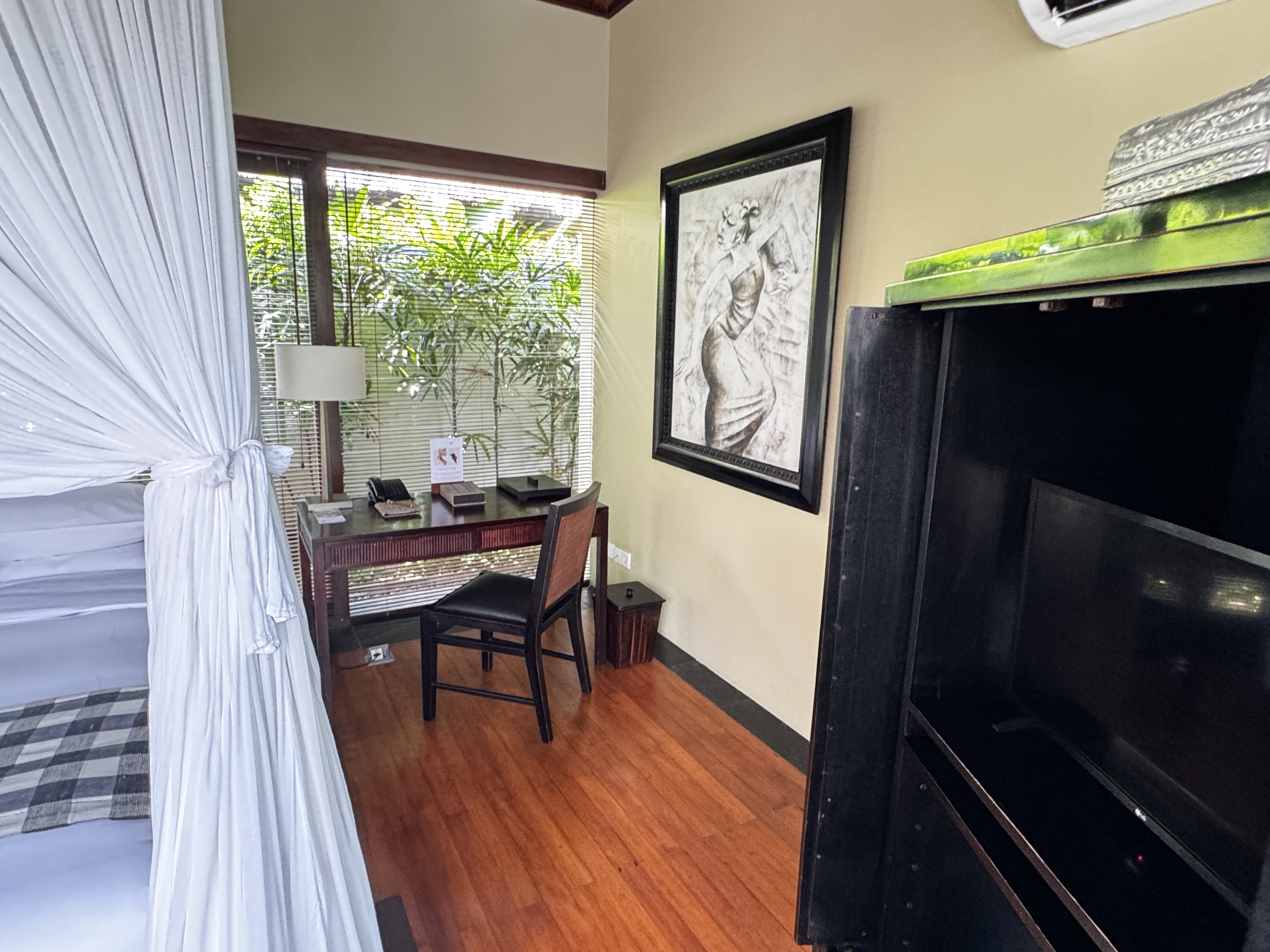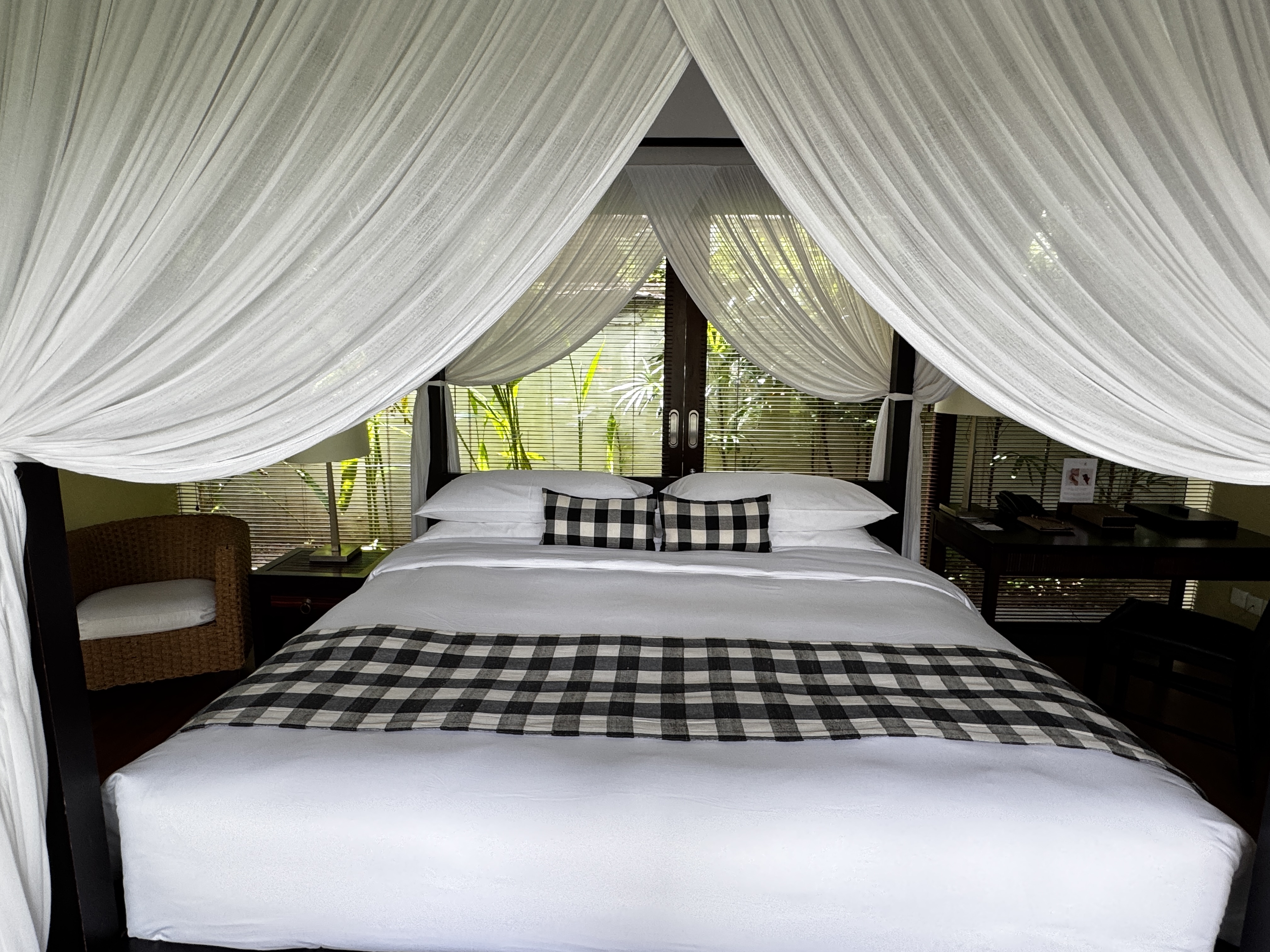 バリヒンドゥー教のシンボル、黒白のチェック柄ポレンの布でセットアップされていて素敵なベッドルームです。