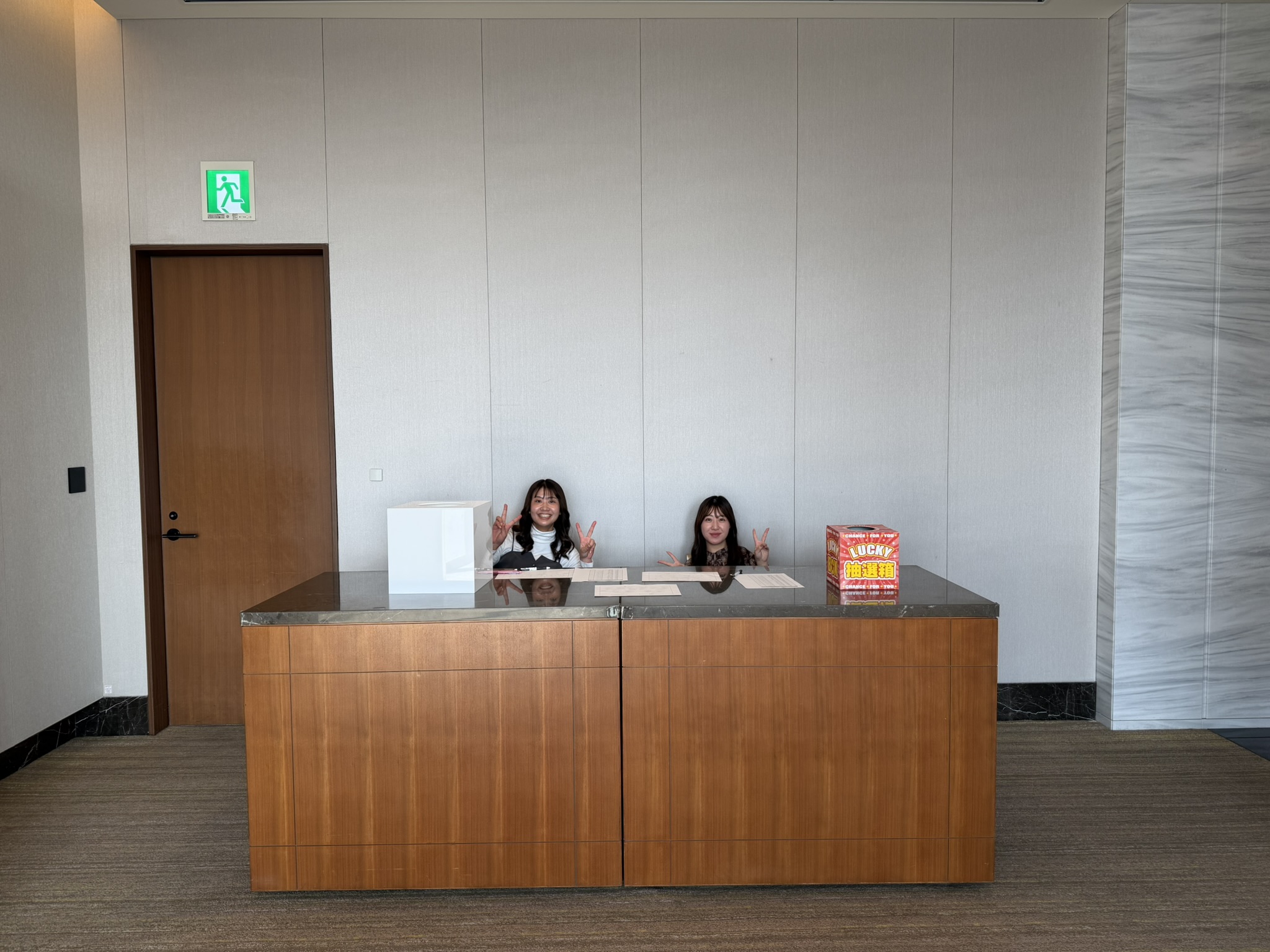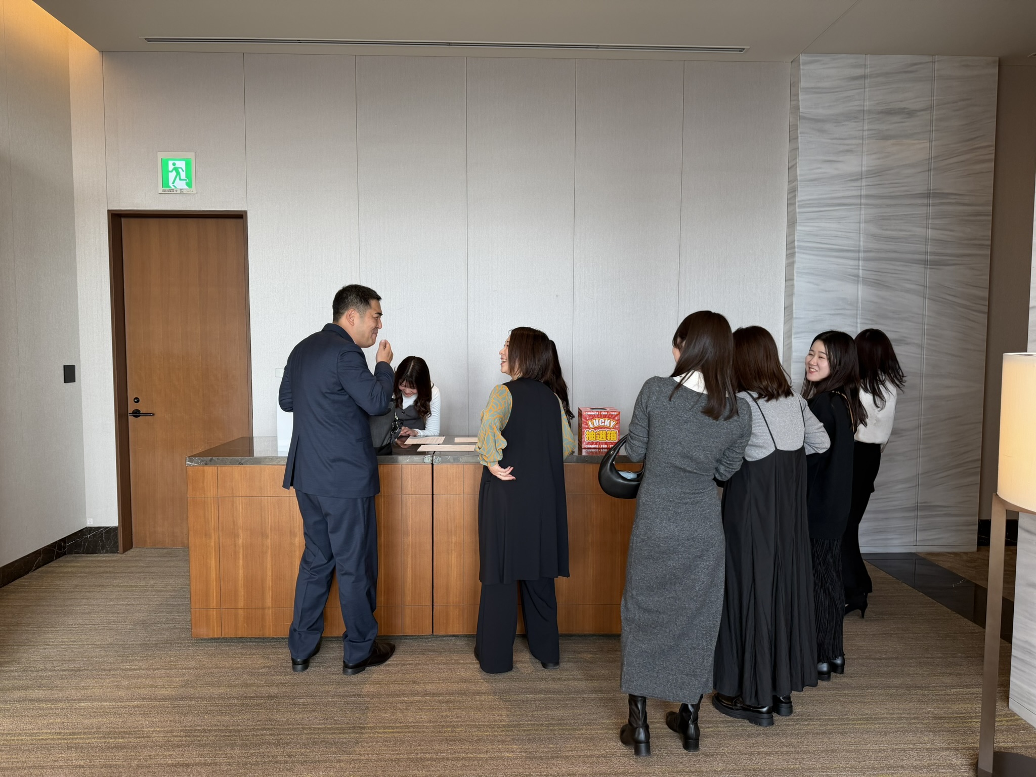 受付では、忘年会で皆が楽しみにしている抽選会のためにボックスに各々の名刺を入れて、席替え後の席が決まるくじ引きをします!受付からワクワクです☆