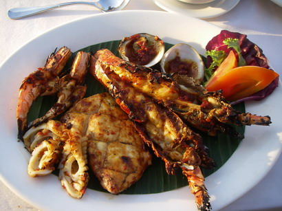 食事は肉厚たっぷりのロブスターや魚介類など、すっごいボリュームのシーフード料理!