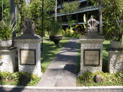 | ヴィラの門がありました。ヴィラは1ベッドルームが9棟、 3ベッドルームが1棟の全10棟。ちなみにロビーで頼めばバギーでも送ってくれます。 今回見せてもらったのは、1ベッドルーム・ヴィラです。 |