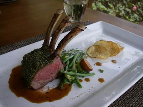 メインはハーブがたっぷりかかった豪快なラムです。まさに骨付き、塊状態のラムラック、